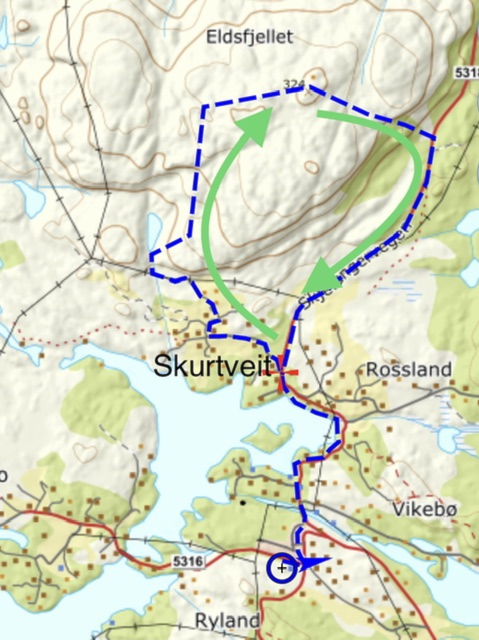 Som kartet under viser har Eldsfjellturen start/mål Leirdalen idrettsanlegg (blå sirkel) og ein følger Rosslandvegen inn på Skurtveitvegen og opp på fjellet ved Skurtveit. På turen over fjellet kan du også gå oppom Veten om du vil, er merka med skilt langs turstien over fjellet. Dette er frivillig. Du kjem ned ved Motorcrossbana på Skjelangervegen, og går tilbake mot Rosslandvegen igjen. Deler av turen går på asfalt og grus vei. (Dette er berre et grovt merka tur/oversikt kart)